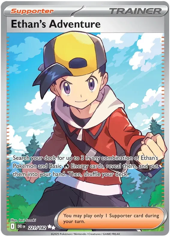 As in every Pokémon game, the Professor asks the famous question, "Are you a boy or a girl?" Here is the first card. This is Ethan's adventure from Destined Rivals. It is one of the few illustrations of the game's main character. Why this card? In my opinion, the character's illustration is the best and most accurate. I also like the setting, as it reminds me of the trees surrounding New Bark Town.