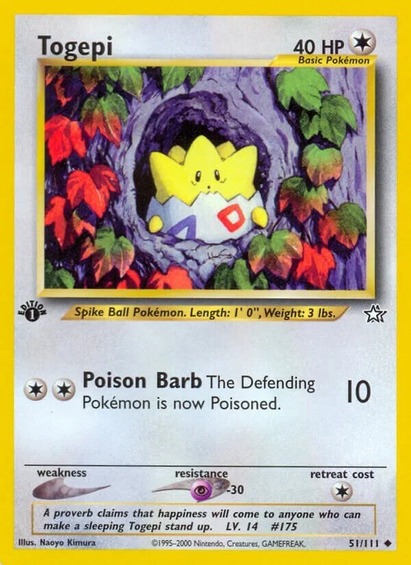 After we obtained our first Gym Badge, Professor Elm gave us the Pokémon Egg that Mr Pokémon had given him. This egg contained a Togepi. I chose this Neo Genesis card because Kimura's illustration is amazing. The illustration resembles life, from the hole-shaped egg in the tree to the leaves arranged in a circle.