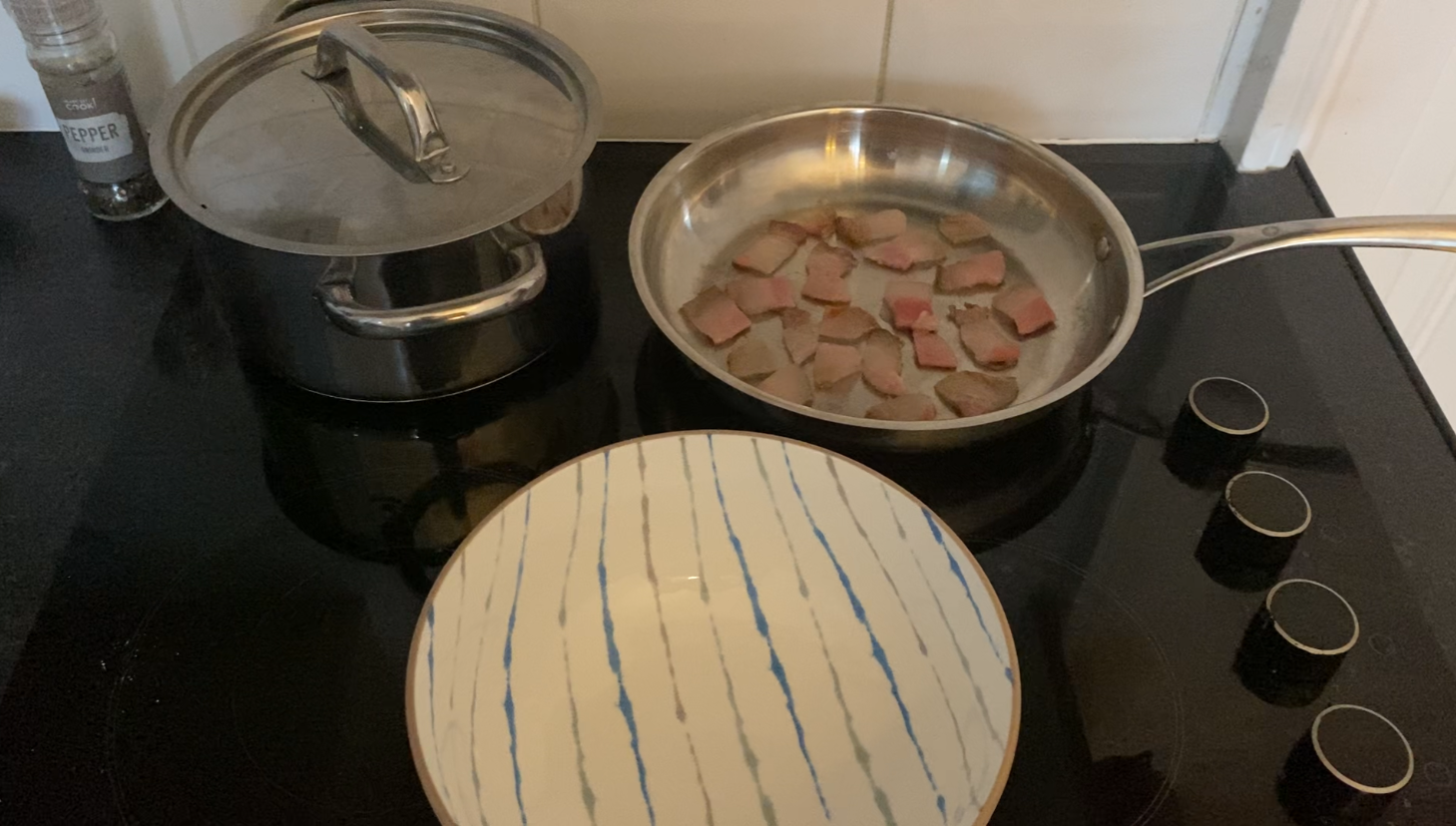 While the guanciale is slowly cooking, bring a pot of water to the boil. Once it is boiling, add salt.